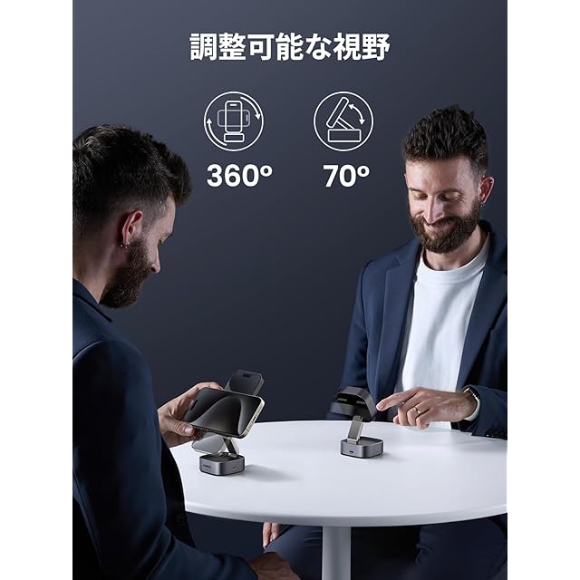 【幅広い互換性】: 複数のデバイスに対応する充電ステーションは、iPhone 16/16 Pro/15 Pro Max/14/13/12シリーズ、AirPods Pro 2/1、AirPods3/2、Galaxy Buds、およびほとんどのQi対応デバイスと互換性があります。MagSafeが組み込まれていないスマートフォンの場合は、シームレスに接続してMagSafe対応のケースで充電できます。