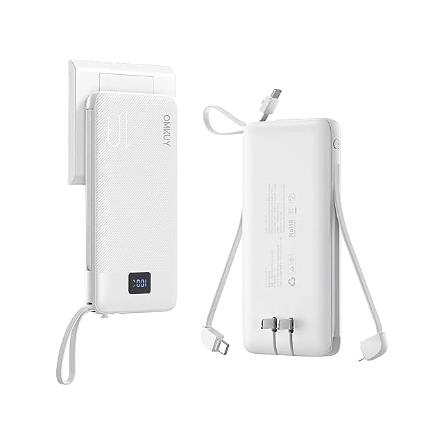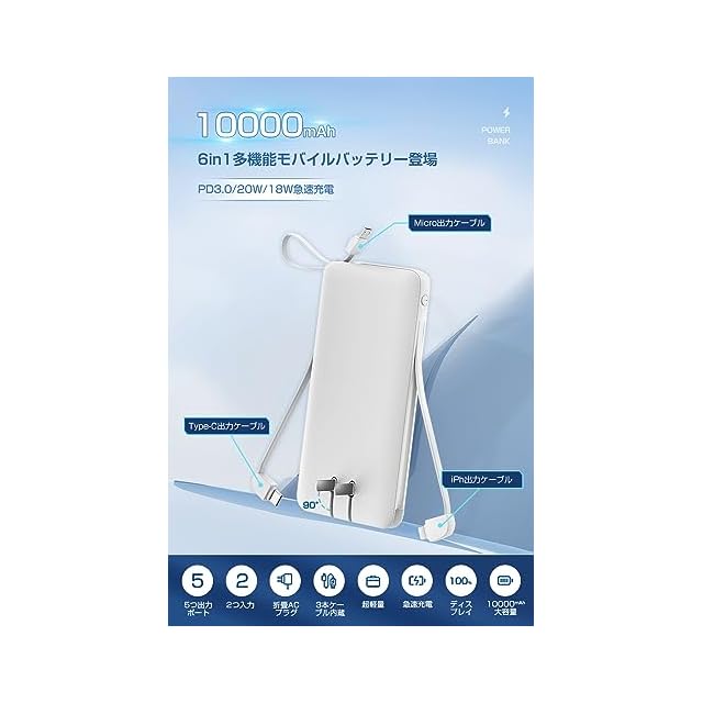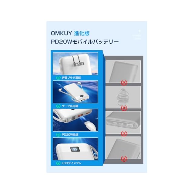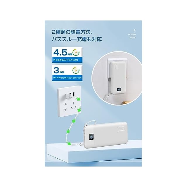商品名:【OMKUY 新登場】モバイルバッテリー 大容量 コンセント 10000mAh 薄型(折り畳みコンセント一体式/パススルー/PD 20W&SCP22.5W急速充電/3本ケーブル内蔵)携帯充電器 持ち運び便利 コンパクト モバイルばってりー PD3.0 携帯バッテリー 軽量 スマホ AC パワーバンク PSE認証 iPhone&Android等対応 (White)