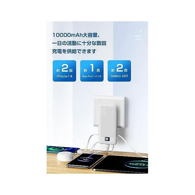 【10000mAh大容量・多機種対応】10000mAh大容量のモバイルバッテリーで、一度フル充電すれば、スマホやタブレットに何度もフル充電できます。iPhone 14約2回、iPhone Xに約3回、Galaxy S10に約2回フル充電ができるので、地震、災害、旅行や出張などに最適で、電池切れの不安を解消します。iphone各機種、タブレット、HUAWEI、Galaxy、Xperia等Android各機種、ほとんどのデバイスを対応します。