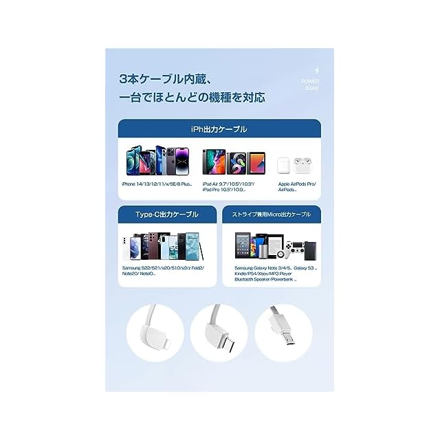 【3種類のケーブル内蔵・5台も同時充電】多機能 モバイルバッテリーのはmicroUSB、iPhone用とtype-Cなど3規格出力ケーブルが内蔵されます。様々なケーブルを持ち歩く必要がなく、各タイプのデバイスにも対応出来ます。更に、Type-C出力/入力ポート、USB-A出力ポート搭載して、合わせて最大5台の機器を同時に充電することができる携帯充電器です。手軽にスマホを充電できる為に、内蔵ケーブルがストラップに変身でき、片手で充電しながらスマホも使用可能、持ち運び超便利です。