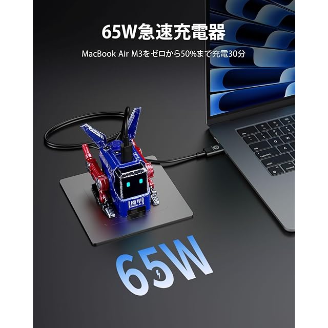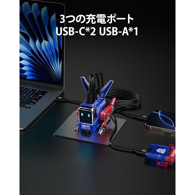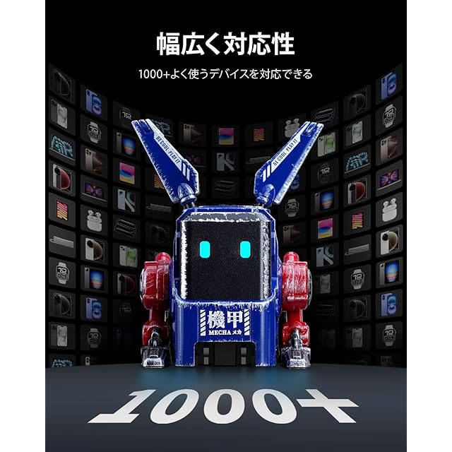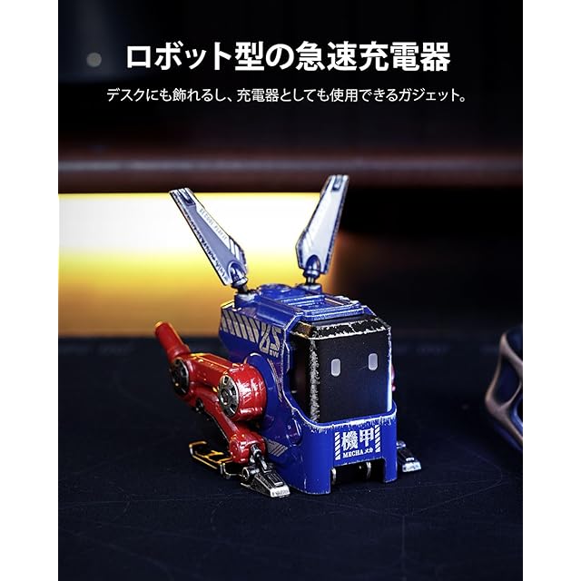 【ひと目でわかる充電状況】LCDスクリーンを搭載し、デバイスを接続すると「機甲の瞳」が自動で青く点灯。約5分後には安定した充電モードに切り替わり、ライトは消灯します。細部まで丁寧に作り込まれ、見た目の楽しさにもこだわった充電器です。※PD充電を行うには、PD対応のケーブルおよびPD対応デバイスをご使用ください。