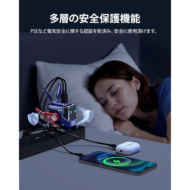 【安心の多重保護設計】過電圧保護・過電流保護・過電力保護・電磁干渉防止・低電圧保護・静電気保護・短絡保護・温度保護の8つの安全機能を搭載。さらに、難燃性のシェル素材を採用することで、充電中のリスクを最小限に抑え、安全性を徹底しました。PSEをはじめとする電気安全規格の認証も取得済みで、安心してご使用いただけます。