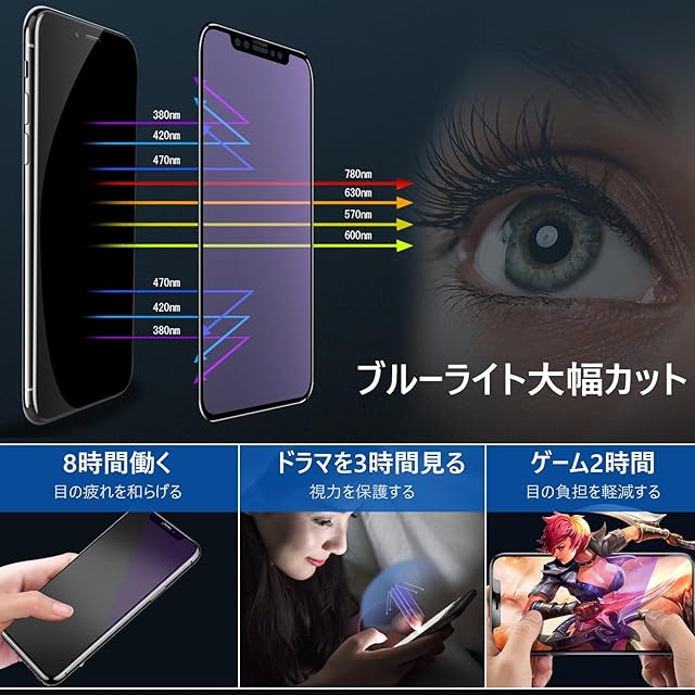 【ブルーライトカット フィルム】MINIKAの いpほね11Pro ガラスフィルム ブルーライトカット率95%、先進ブルーライトカット反射技術によりブルーライトを大幅にカットでき、色素沈着を防止、目に掛かる負担を軽減し。(ブルーライトの部分が吸収され、三原色の赤と緑との割が増えて、画面淡い黄色に見える。)