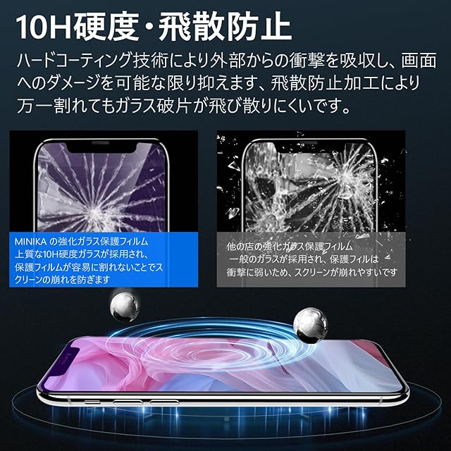 【10H硬度・高品質素材】MINIKAの iPhoneXs ガラス保護フィルム。10H硬度ガラスを採用し、ハードコーティング技術により外部からの衝撃を吸収し、画面へのダメージを可能な限り抑えます、スクラッチ防止。【製品の特徴】 全面保護/気泡なし/耐衝撃/剥がれない/綺麗/飛散防止。