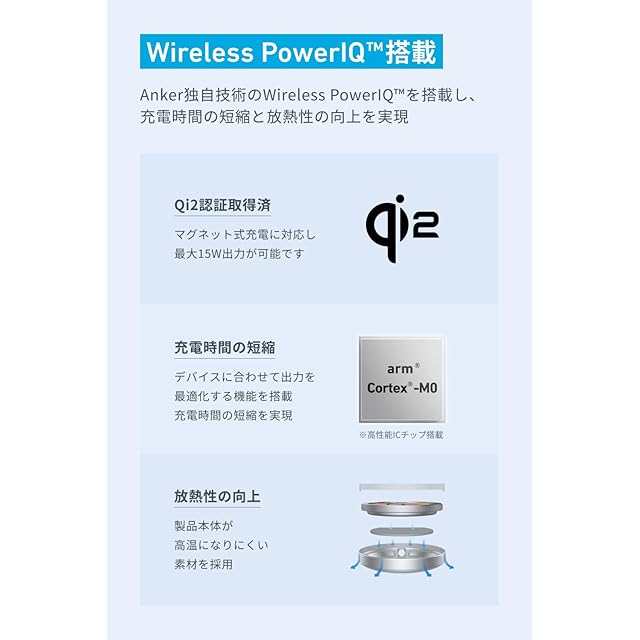 Wireless PowerIQ 搭載:Anker独自のWireless PowerIQを搭載し、充電時間の短縮と放熱性の向上を実現しました。