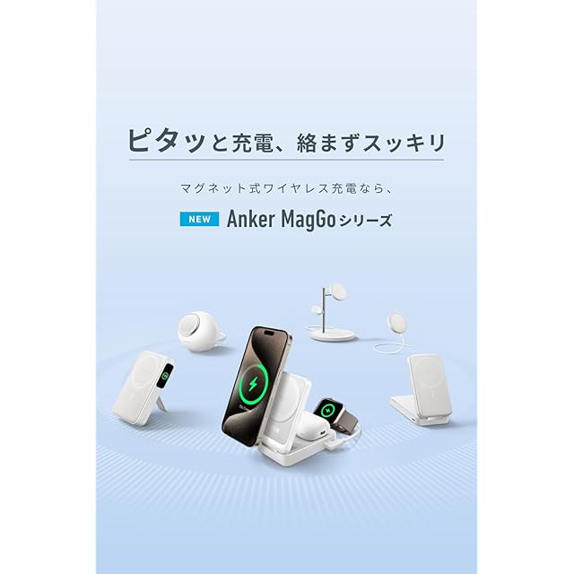 ピタッと充電、絡まずスッキリ:マグネット式ワイヤレス充電対応の充電パッド。Qi2対応のiPhoneに従来のAnker MagGoシリーズの2倍の最大15W出力でワイヤレス充電が可能です。