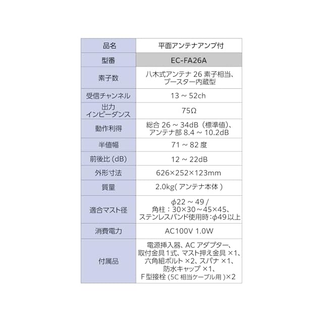 DXアンテナ アンテナ 地上デジタルアンテナ (ブースター内蔵) UHF 壁面(26素子相当) オールチャンネル(13ch.~52ch.)対応 小型 簡単に組み立て 中・弱電界地域向け EC-FA26A | TREND DESIGN 家電専門店