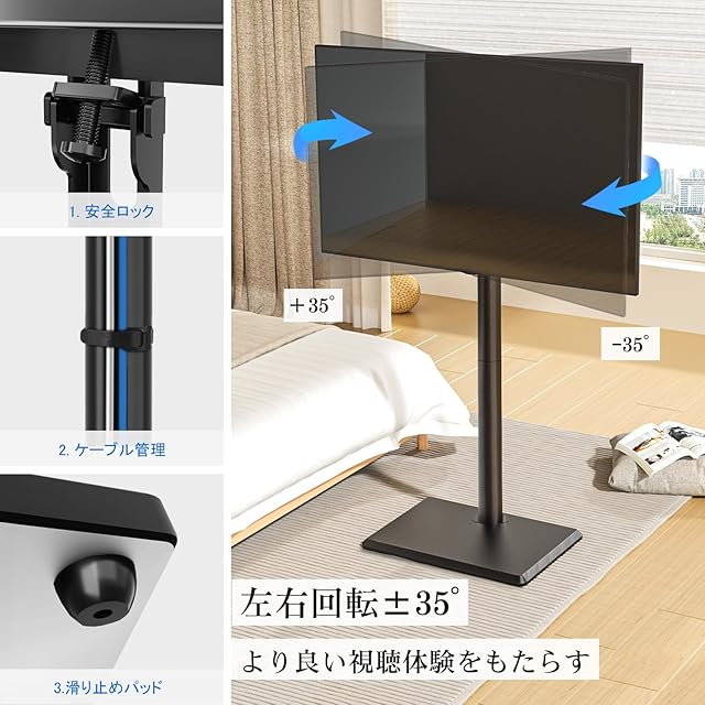 高さ調節・左右首振り: tvスタンドはブランケットが3段階で113.8~139.3 ㎝まで調整できます。左右角度35°変えられ、首振りが出来ます。リビングルームでもキッチンでも各部屋からテレビを快適に楽しめます。