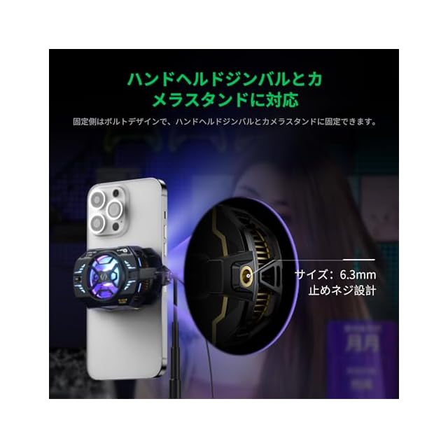 【汎用性】収納可能なクリップ付きスマホクーリングファンは、AndroidでもiPhoneでも、ほとんどのスマートフォンにフィットします。* スマホクーラーは6.7-8.8cm幅のデバイスをサポートします。片側には、ハンドヘルドジンバルやカメラマウントに取り付けるためのボルトデザインが含まれています。