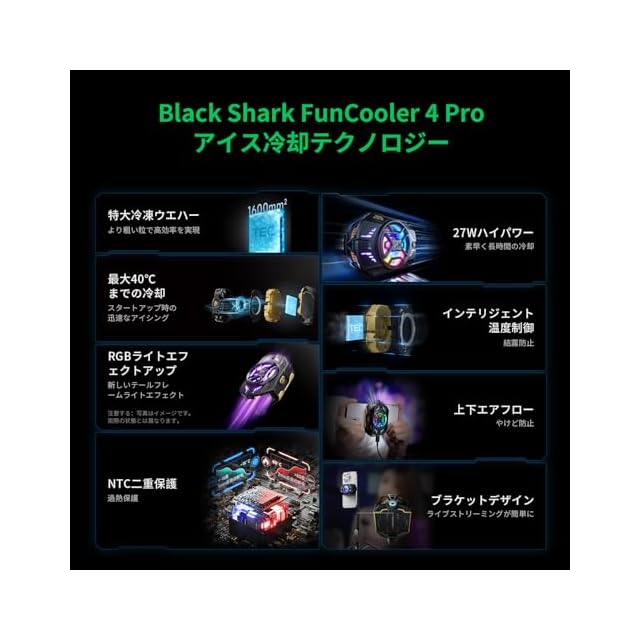 商品名:スマホ 冷却ファン Black Shark FunCooler 4 Pro、27W スマホクーラー、スリープタイマー/ファンの速度の設定、6.7-8.8 cm iPhone/Android 用ヒートシンク、携帯電話のラジエーターRGBライト付き