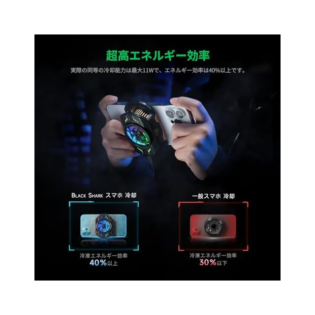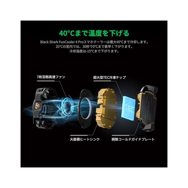 【27Wパワー超高速冷却】Black Sharkスマホクーラーは高性能半導体冷凍技術を採用し、非常に強力な放熱を実現します。最大温度降下は40℃です。7枚羽根の高速ファンと超大型TECの設計により、25℃の室内でスマホの温度を0℃まで下げるのに30秒しかかかりません。注:使用には電源への接続が必要。