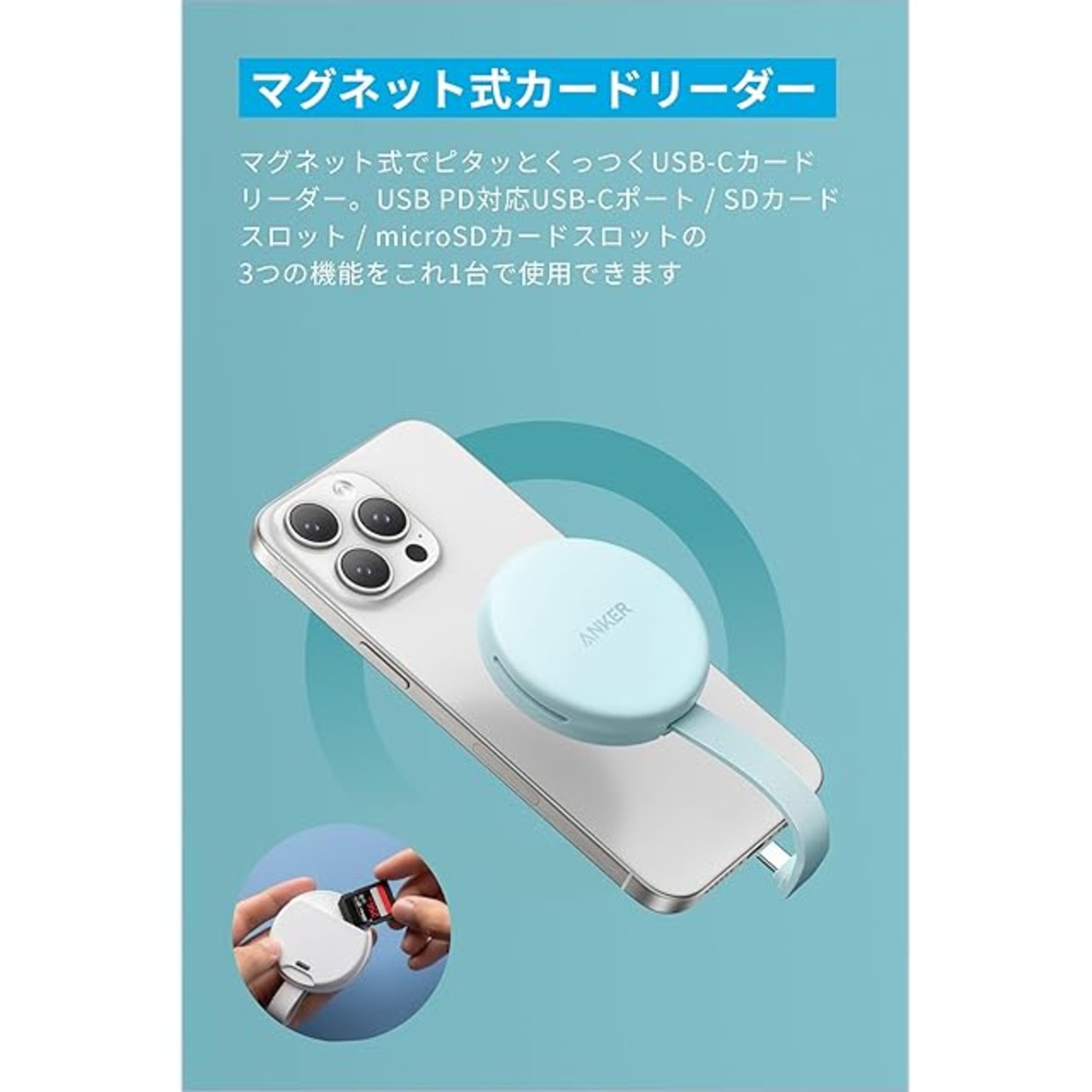 商品名:Anker MagGo USB-C カードリーダー (3-in-1, 10Gbps) ミントブルー USB PD対応USB-Cポート SDカードスロット microSDカードスロット最大10Gbpsで高速データ転送 最大42.5W高出力 パススルー急速充電マグネット式カードリーダー