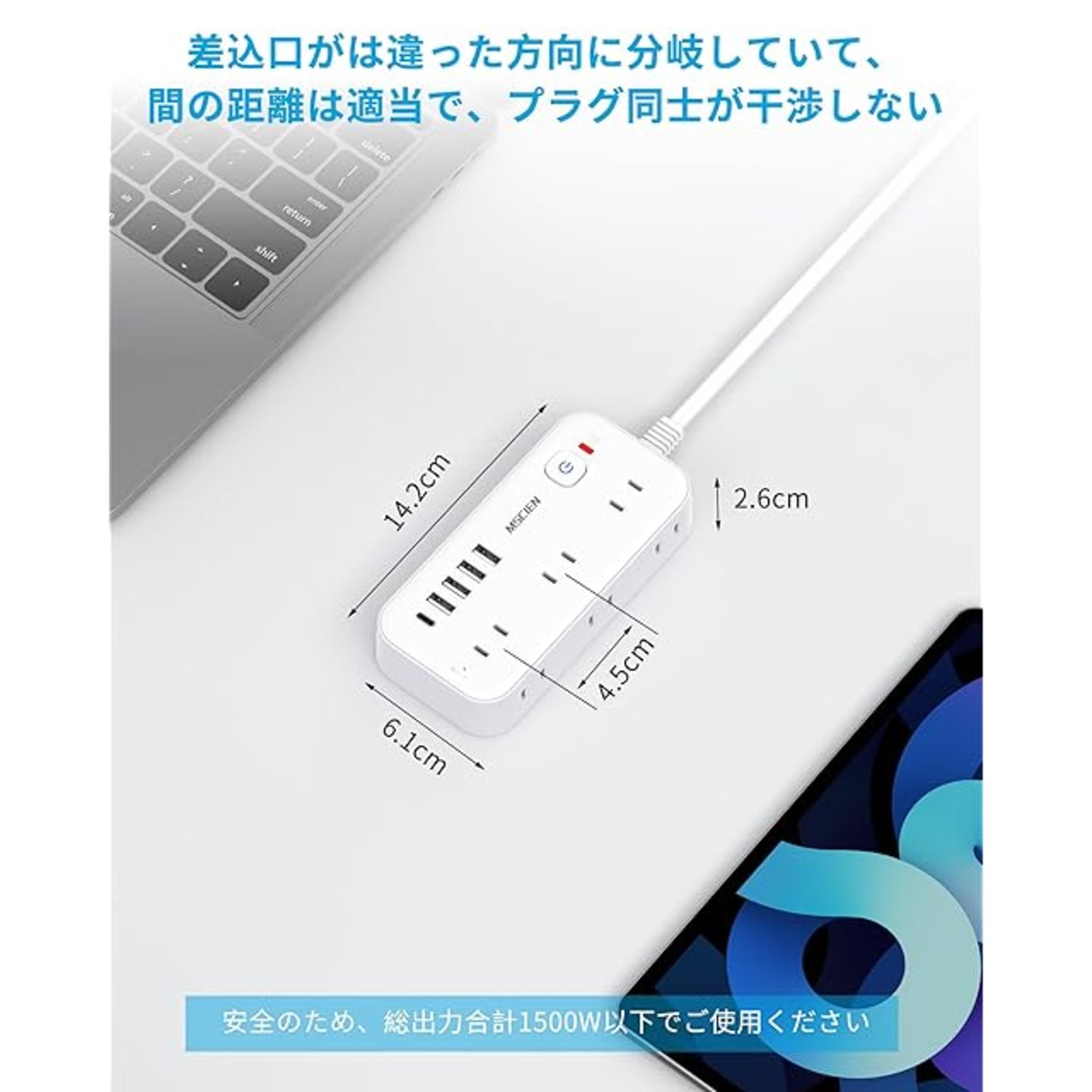商品名:延長コード 3m 電源タップ コンセントタップ タコ足配線 Mscien 6個AC口 4usb-a 1usb-c スイッチ付き 雷ガード 電源コード 蛸足コンセント コンセント 分岐 たこあし oa マルチタップ おしゃれ 横差し 延長 コード 壁掛け/卓上に (3M)