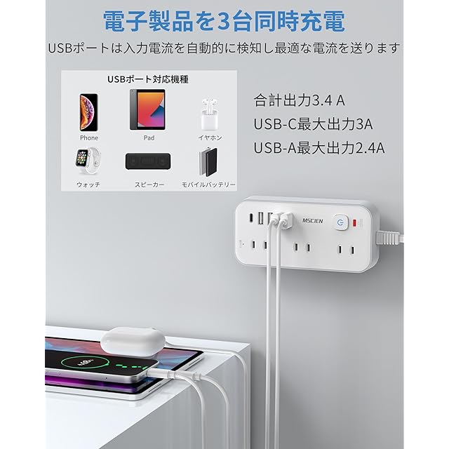 電源タップusb:テーブルタップの各USBポート合計3.4 A出力。USB-Aポートは最大5 V/2.4 A出力で、設備に最適な電流を流す。type-cポートは最大5 V/3 A出力で、充電がより便利です。