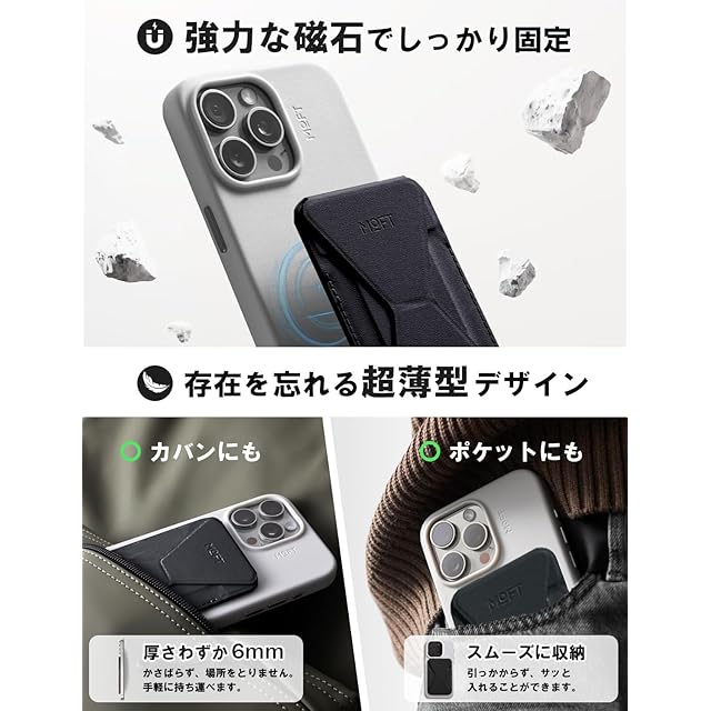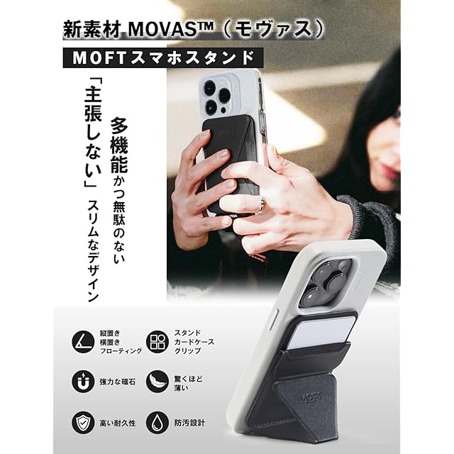 商品名:MOFT スマホスタンド 【MOVAS™ 耐久&磁力強化版】 Snap-On iPhone 15 iPhone14 iPhone13 iPhone12 MagSafe対応 傷や汚れに強い マグネット カードケース 最大2枚収納 iPhoneスタンド Pro Plus ProMax マグネット 磁石 磁気吸着 薄型軽量 折り畳み式 持ち歩き便利 ミニマリスト サステナブル (ジェットブラック)