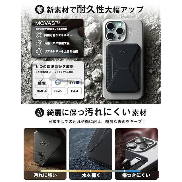✨【最新のヴィーガンレザー「MOVAS」採用!洗練されたスリムデザインで高耐久性】 「MOVAS」は、MOFTが誇りを持って開発したヴィーガンレザーで、その特長は一見の価値があります。この素材は驚くほど繊細な手触りを備えながら、同時に高い耐久性を持ち、さらには環境への優しさも追求しています。その結果、この素材を使用したスマホスタンドは、優れた張力と靱性を誇り、ポケットにキーホルダーやカードキーと一緒に収納しても傷がつきにくいのが特長です。洗練されたスリムデザインは、ユーザーに高級感をもたらし、日常のスタイリッシュな使い勝手を追求した結果として、このヴィーガンレザーのスマホスタンドは他と一線を画しています。
