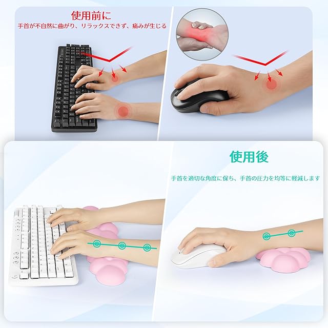 エルゴノミック クラウド型デザイン:特別なクラウド型デザインが手首にぴったりフィットし、手首が正しくアラインされることで、手首と腕の圧力を瞬時に軽減し、まるで雲の中にいるかのような感覚を提供します。凹凸のある表面デザインにより、手首の空気循環が促進され、汗を防ぎます。手根管症候群(CTS)の改善に効果的です