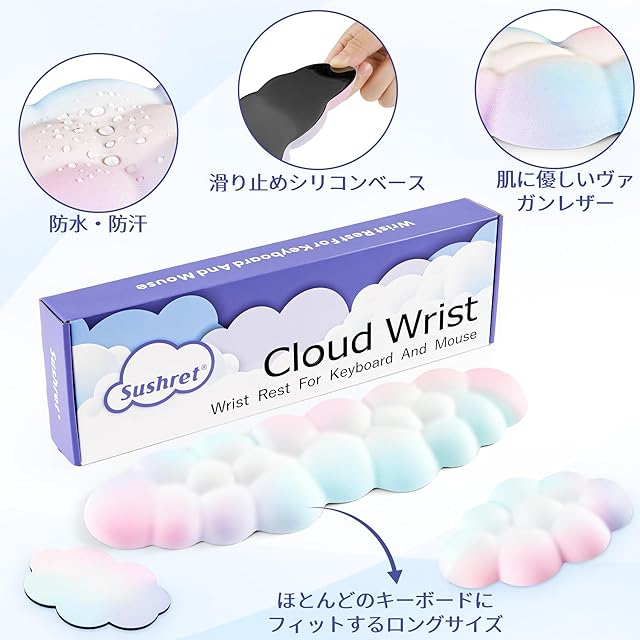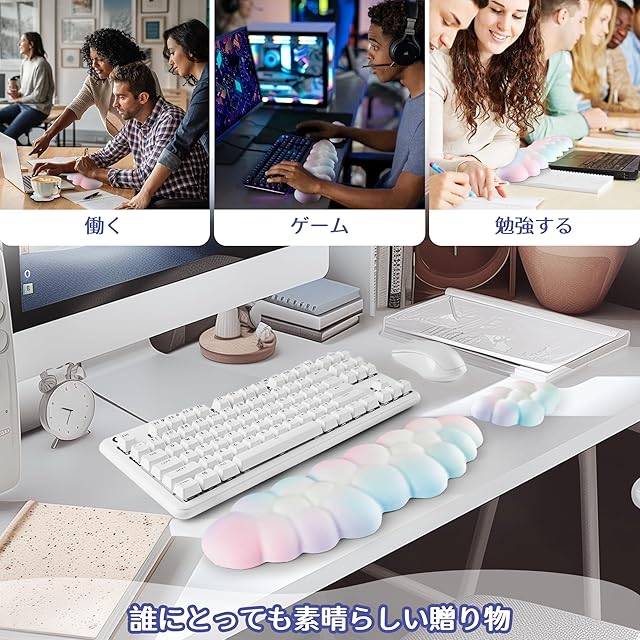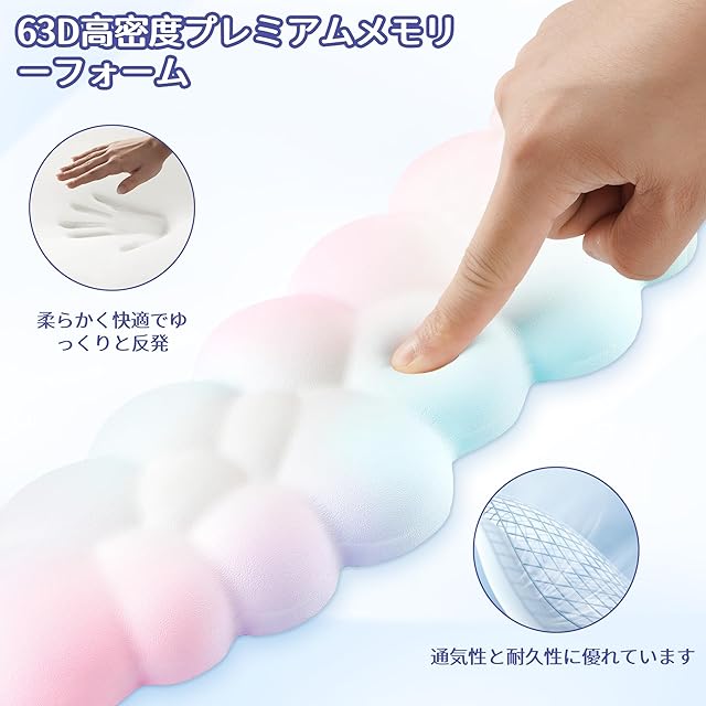 クラウドソフトコンフォート:プレミアム63D高密度メモリーフォームと新しいソフトで通気性のあるレザー生地を使用し、肌にフィットして非常に快適です。このかわいくてふわふわしたクラウド型キーボードパッドは、耐久性があり、あなたの手に完璧にフィットします。ゲームやオフィスでのデスクに最適な相棒です