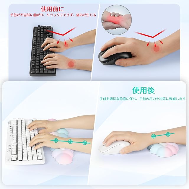 エルゴノミック クラウド型デザイン:特別なクラウド型デザインが手首にぴったりフィットし、手首が正しくアラインされることで、手首と腕の圧力を瞬時に軽減し、まるで雲の中にいるかのような感覚を提供します。凹凸のある表面デザインにより、手首の空気循環が促進され、汗を防ぎます。手根管症候群(CTS)の改善に効果的です