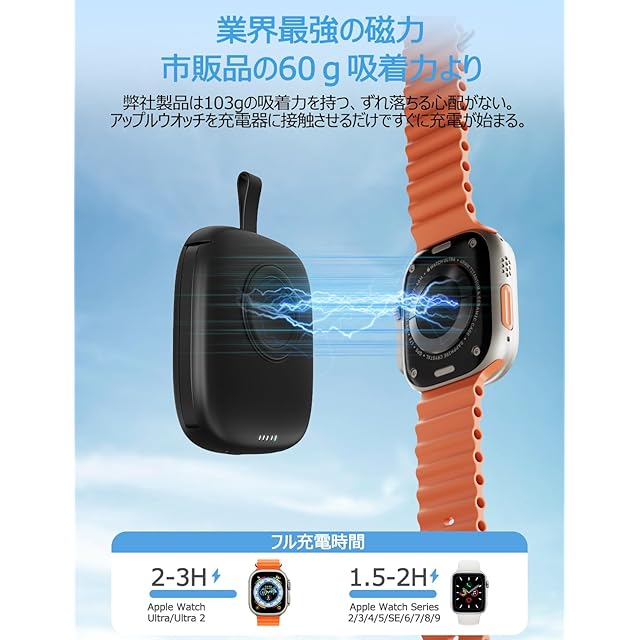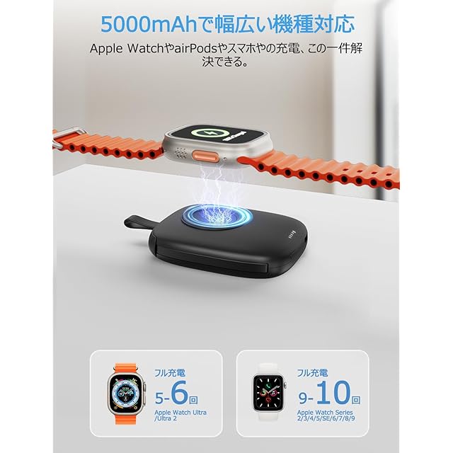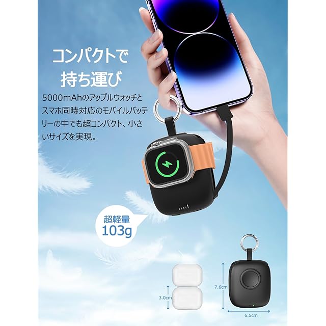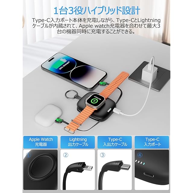【Apple Watch全シリーズに完全対応】 最先端のワイヤレス磁気接続充電センサーパネルを搭載しており、 Apple Watch Series 9/8/7/6/5/4/3/2、SE、SE2、Ultra、Ultra2などの全シリーズモデルを完全サポート、お使いデバイスが使用できるなど悩みは心配不要、楽に問題を解決する。 Apple Watch専用設計のため、他ブランドのスマートウォッチには対応しておりませんことをご了承ください。 【2本ケーブル内蔵で最大3台同時充電】 Type-CとLightningケーブルを内蔵したマルチ充電モバイルバッテリーが登場。 外出先でもお使いの機器をいつでも充電可能、ケーブル絡まりの困るとか、外出時充電ケーブルが忘れてとか心配なく。 更に、Apple Watch専用充電器との組み合わせで、Type-C入力ポートから本体充電中に3台のデバイスを充電できる。 家族や友人との旅行や出張などで、複数のスマホやデバイスの充電が必要な時でもこの一台で十分です。 【Type-Cケーブル内蔵で充電・放電両対応】 本体充電ケーブルとして使用できるType-Cケーブルを内蔵しており、外で泊まる時にわざわざケーブルとアダプターを用意しなくても大丈夫、USBコネクターがあればいつで本体へ充電可能。 他の充電設備を用意しないのために、お荷物を減らすのこともできる。 【5000mAh容量バッテリー搭載・残量一目瞭然】 5000mAhのアップルウォッチとスマホ同時対応のモバイルバッテリーの中でも超コンパクト、小さいサイズを実現。 Apple Watch Series 9/8/7/6/5/4/3/2を9~10回フル充電、Apple Watch Ultra、Ultra2を5~7回フル充電。 iPhone 15を約1回フル充電可能、日常使用にはバッチリ、電池切れや容量不足の心配不要。災害や停電時にも役立つ頼れるアイテム。 電池残量は4段階のLEDランプで確認できるため、残量不足時のタイムリーな充電が可能。 【カラビナ付きで携帯性抜群】 103gの超軽量コンパクト設計で、手のひらサイズのため片手で収まり、お遊び時にも負担ない、持ち歩く充電には最適。 ポケットにもスッキリ収納可能、便利なカラビナ付きでバックやキーホルダーに吊り下げられ、紛失防止に役立つため、旅行、出張、キャンプ、登山、スポーツなどあらゆるシーンで大活躍。 【PSE認証取得で安全性も万全】 内蔵リチウムイオン電池はPSE認証とMETI証明書を取得しており、過電流、過電圧、過熱保護などの多重保護機能を備えた充電器により、 安全な充電環境を提供。充電完了後は自動的に充電を停止する。電池の過充電を防ぎ、Apple Watchやスマートフォンのバッテリー寿命を延ばします。