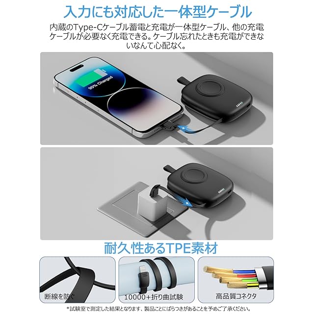 商品名:モバイルバッテリー【2025新登場・Apple Watch & スマホ充電可能・充放電一体ケーブル内蔵】アップルウォッチ充電器 携帯充電器 5000mAh 超軽量 小型 薄型 USB-C&iPhone用ケーブル内蔵 最大3台同時充電 apple watch全シリーズ/iPhone/Androidに対応 出張/アウトドア/キャンプ用 PSE認証済