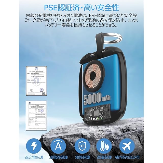 【カラビナ付きで携帯性抜群】 103gの超軽量コンパクト設計で、手のひらサイズのため片手で収まり、お遊び時にも負担ない、持ち歩く充電には最適。 ポケットにもスッキリ収納可能、便利なカラビナ付きでバックやキーホルダーに吊り下げられ、紛失防止に役立つため、旅行、出張、キャンプ、登山、スポーツなどあらゆるシーンで大活躍。