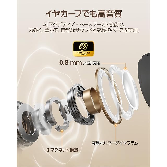 【迫力と繊細さを両立したサウンド体験・音漏れ防止】グラミー賞&エミー賞受賞者Claudioがおすすめの音質。AIベースブーストが低音を自動補正し、立体感のある空間オーディオを提供、空間全体を包み込むような立体音響を実現しました。このイヤーカフイヤホンは、革新的な3マグネット構造と0.8mmの振幅設計で、より広がりのある音場を実現、まるでコンサートやlive現場にいるかのようにリスニング体験をお楽しめます。さらに指向性オーディオ技術と自動ビーム調整機能により、周囲への音漏れを最小限に抑えつつ、他人の迷惑を気にせず、オープンイヤーでも没入感のある音楽体験が楽しめます。