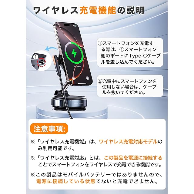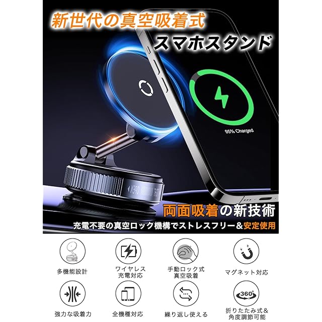 商品名:PACEIN スマホホルダー 真空吸着 手動強力吸盤【ワイヤレス充電+Mag-safe対応】真空吸着式スマホホルダー 真空スマホホルダー 車 360°回転 折りたたみ式 落下防止 コンパクト 卓上&車内兼用 iPhone&Android多機種対応(充電機能あり)