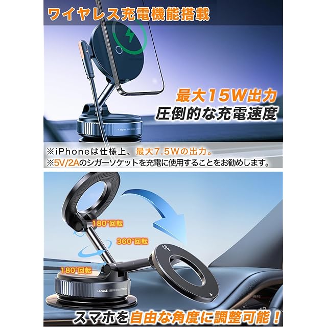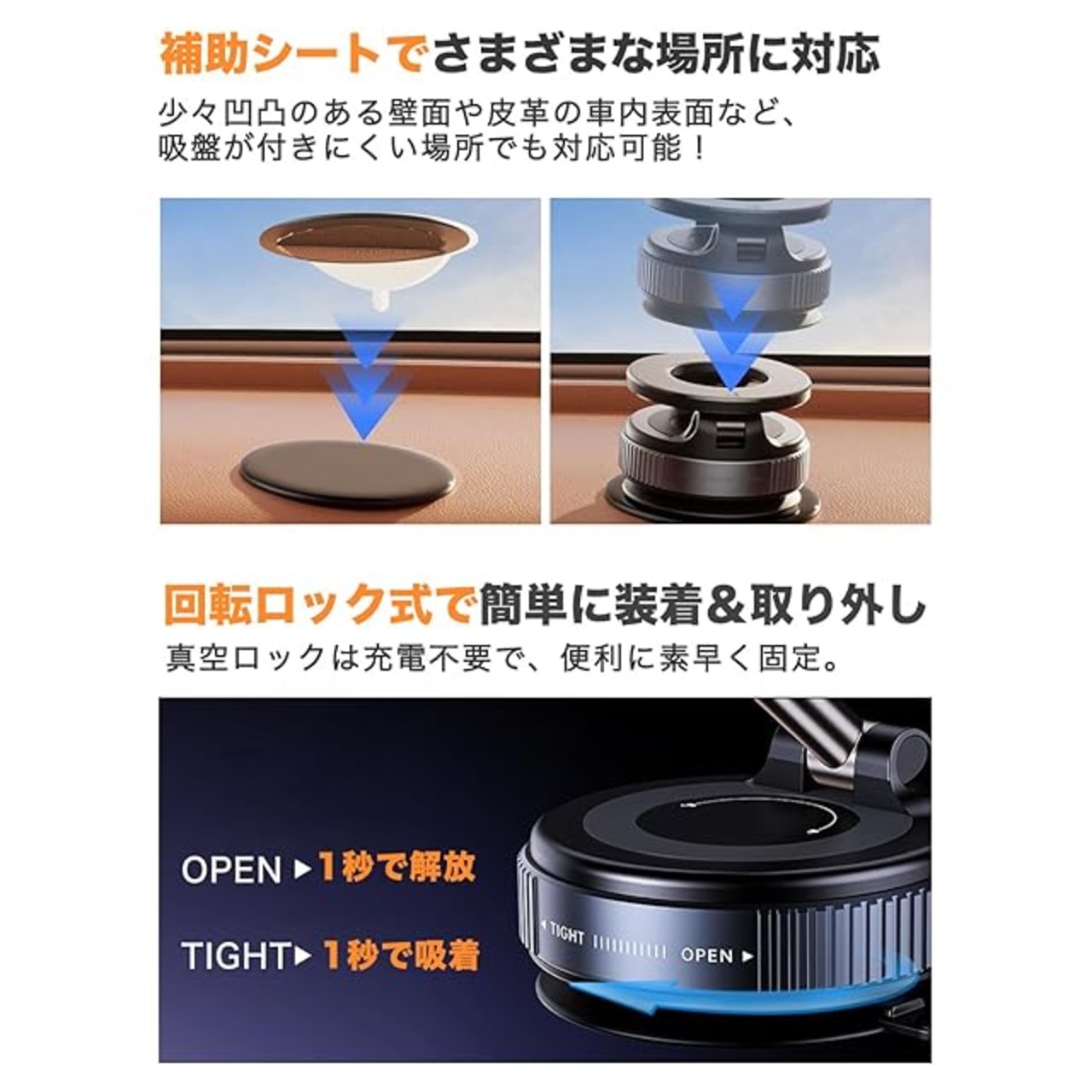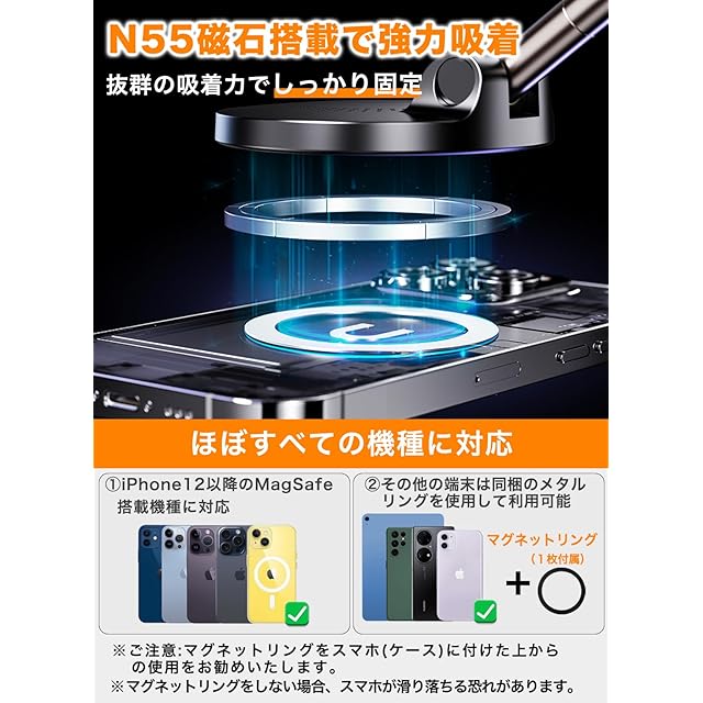 ✅【強力なMagSafe固定機能】スマートフォンの固定はMag-Safeマグネットで行い、付属のメタルプレートを使用することで、非Mag-Safe対応の機種でも利用可能です。用途や設置場所に応じて、Mag-Safeマグネットによる固定と真空吸着を使い分けることができます。