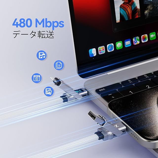 【4-in-1 & LEDディスプレイ】 PZOZのデザインコンセプトはあなたの生活をシンプルにします。 4 つのポートと LED ディスプレイを 1 本のケーブルにまとめています。 USB A to C、USB A to Lightning、USB C to Lightning、USB C to USB C。シンプルさと効率性。