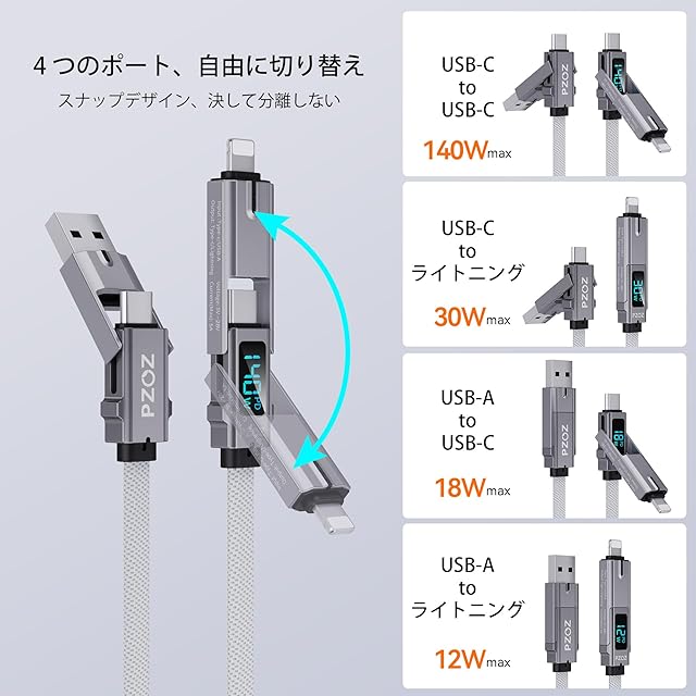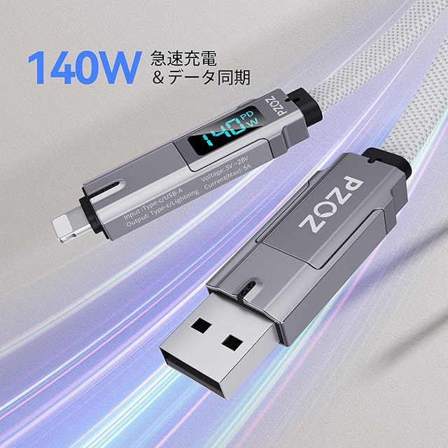 商品名:PZOZ 充電ケーブル 4in1 LEDディスプレイ 最大対応140W ケーブル USB C to USB C/タイプc to ライトニング/USB A to USB C/USB A to Lightning 5A 急速充電 PD Macbook/iPhone/iPad/Samsung Galaxy/Google Pixel/Switch 対応
