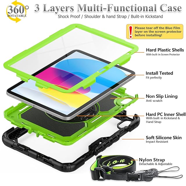 Product Descriptions</b><br><br><b>Features</b><br>1.Built-in kickstand will makes you using your case for ipad 11th 10th Generation easily, when you are watching video or playing games.<br>2.360 degrees rotating/Shoulder Strap are more convenient for you to carry your case for ipad 11th 10th Generation 2025 2022 / 11th gen/ 10th gen case for ipad 11/10.9 inch. <br>3.Colourful design can make your case for ipad 11th/10th Generation looks fashionable.<br><b>Shock prevention</b><br>Keeps case for ipad 11th/10th Generation away from Shock, prolonging the lifetime of case for ipad 11 / case for iPad 10.<br> <b>Dust prevention</b><br>Port plugs of the case protect dust from entering into case for ipad 11th/10th Generation's screen, making case for ipad stay clean and debris free.<br><b>Anti-scratch function</b><br>Guard against fingernails or other sharp objects scratching 11th 10th Gen case for ipad for maintaining case for ipad 11th 10th Generation's complete appearance.<br><br><b>Package Contents</b><br><br><b>1 x case for ipad 11th 10th Generation 11/10.9 inch 2025/2022</b> >>> 3 pieces combination installation, heavy duty full-body case for ipad 11/10, with portable shoulder strap, built-in kickstand, PC & silicone material.<br><b>1 x Portable Shoulder Straps</b> >>>The shoulder strap is easy to attach and remove, it can use together or <br>separate with your case for ipad 11th 10th Generation. With the strap can make your case for ipad using easily when you go to school, to work and on vacation without the need for a purse, bag or backpack. It can hang from anywhere for your better entertainment.<br> <b>1 x Clean Cloth</b> >>> Lint free, soft, reusable, easy to wash and quick drying.<br> <b>1 x User manual front card</b> >>> Our user manual front card can help you install it easily & clearly.<br><br><b></b><br>SEYMAC stock Team is a professional high-quality team servicing for customers when you're purchasing SEYMAC stock case for ipad 11th 10th generation.<br>