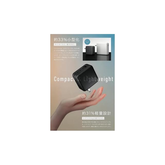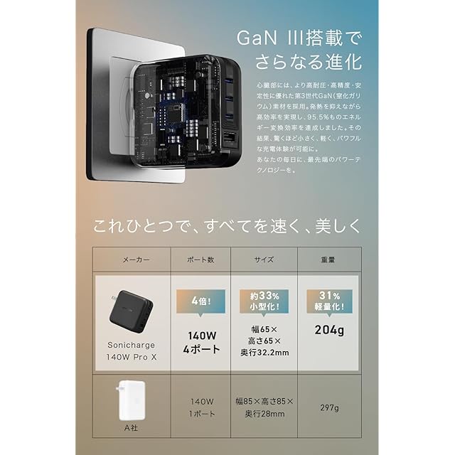 【GaN III搭載で、さらなる進化】心臓部には、より高耐圧・高精度・安定性に優れた第3世代GaN(窒化ガリウム)素材を採用。発熱を抑えながら高効率を実現し、95.5%ものエネルギー変換効率を達成しました。その結果、驚くほど小さく、軽く、パワフルな充電体験が可能に。あなたの毎日に、最先端のパワーテクノロジーを。