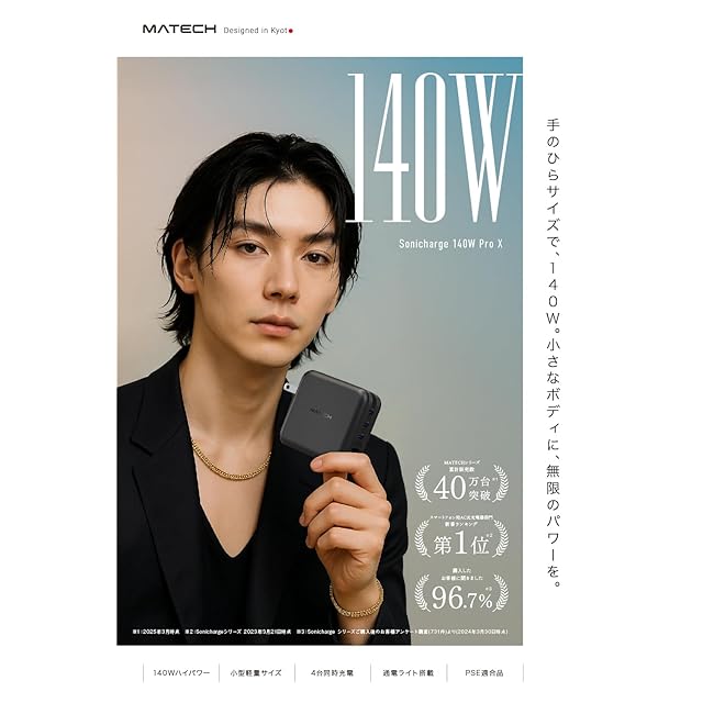 【単ポート最大140W出力】あなたの時間をもっと大切に。Sonicharge 140W Pro Xなら、USB-C単ポートで最大140Wの超パワーを発揮。最新のPD3.1規格に対応し、16インチMacBook Proをわずか27分で50%充電する驚きのスピードを実現しました。ビジネスもクリエイティブワークも、中断させない。パワーが必要なとき、すぐに応えてくれる、頼れる存在です。※単ポート140W急速充電は、PD3.1対応機器のみ可能です。