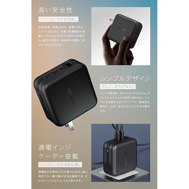 【高い安全性】パワフルなのに、守りも万全。温度管理、過電流防止、過電圧防止、ショート防止など、多重の保護機能を搭載し、さらに日本のPSE認証も取得済み。毎日の使用も、長時間の充電も、安心して任せられます。
