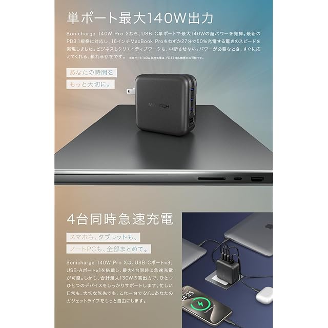商品名:MATECH(マテック)® 充電器 140W Type-C 急速 USB PD【GaN III採用/タイプC+A/折りたたみ式プラグ/Macbook・ノートパソコン・iPhoneシリーズ対応】(Sonicharge 140W Pro X, ブラック)
