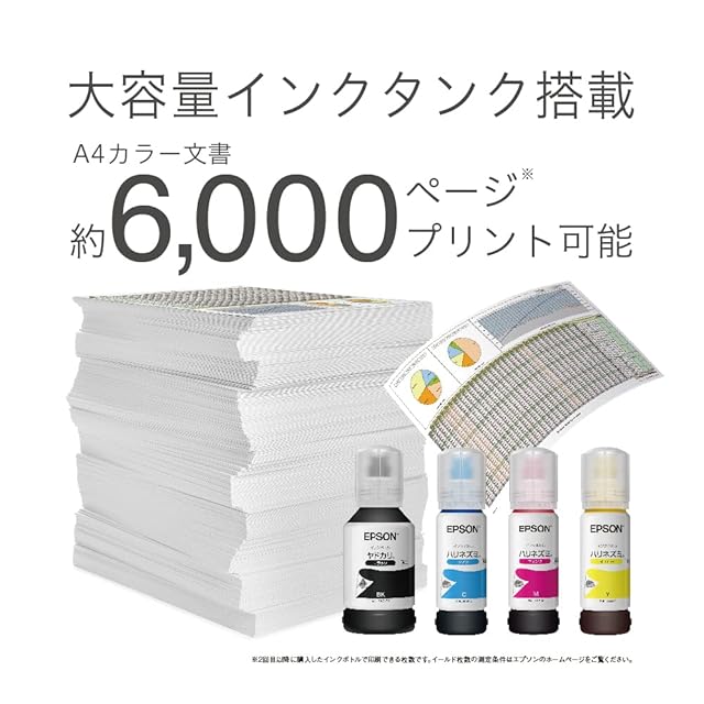 ケタ違いの低印刷コスト&大容量 A4モノクロ文書で約0.4円(税込)(注1)、A4カラー文書が約1.0円(税込)(注1)というケタ違いの低印刷コストを実現。さらに大容量インクタンク搭載で、気軽にジャンジャンプリントできます。