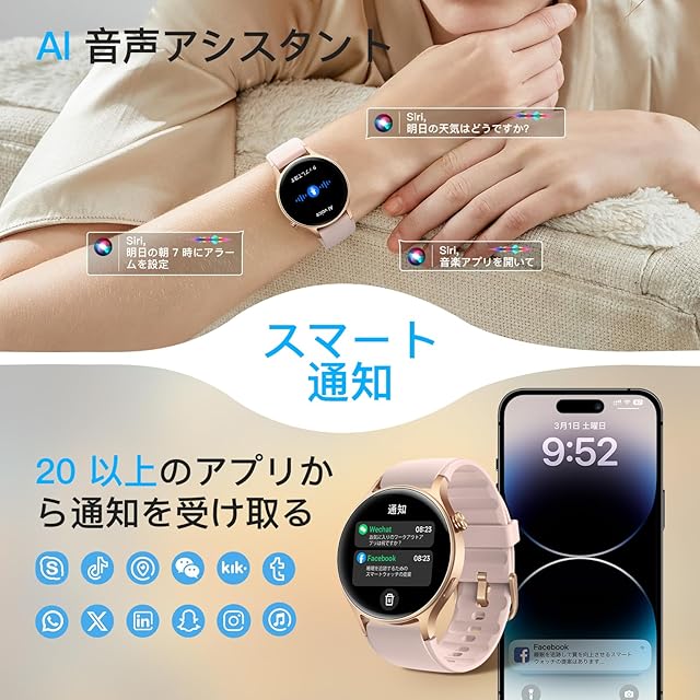 【24時間カロリー管理&多種機能&専用アプリ】 このレデイーススマートウォッチは、あまり水を飲まない使用者様に水飲み注意、座りすぎを防ぐために座りがち注意、睡眠質を記録できる機能。それだけではなく、もっと嬉しい機能もあり:常時表示、着信通知、IP68レベル防水、天気予報、騒音測定、懐中電灯、音楽制御、カロリー消費計算、スマホ探し、腕上げ点灯 など、veryfitアプリをダウンロードして、もっと面白い機能を発見しましょう。