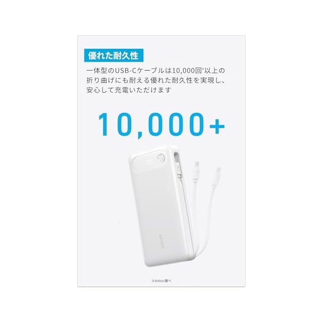 優れた耐久性:約10,000回の折り曲げにも耐える優れた耐久性を実現しているため、ケーブル内部のワイヤーを断線から保護し、安心して充電することができます。 (Anker調べ)