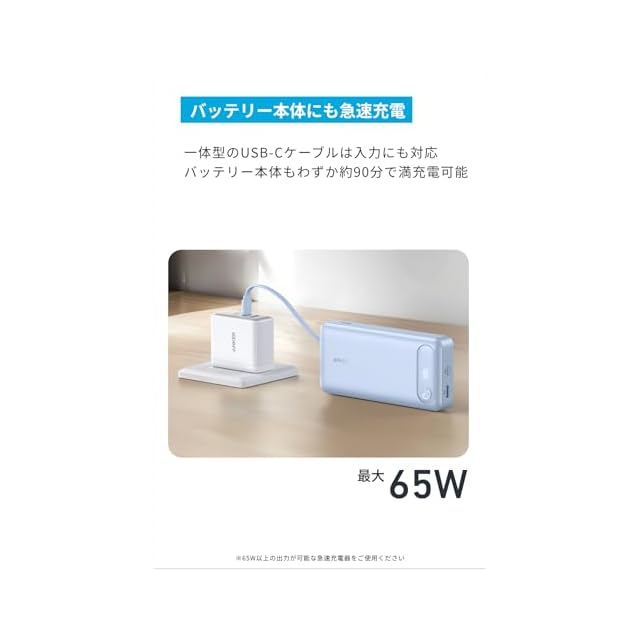 バッテリー本体にも急速充電:内蔵USB-CケーブルもしくはUSB-Cポートを通じてバッテリー本体へも最大65Wで充電することができます。