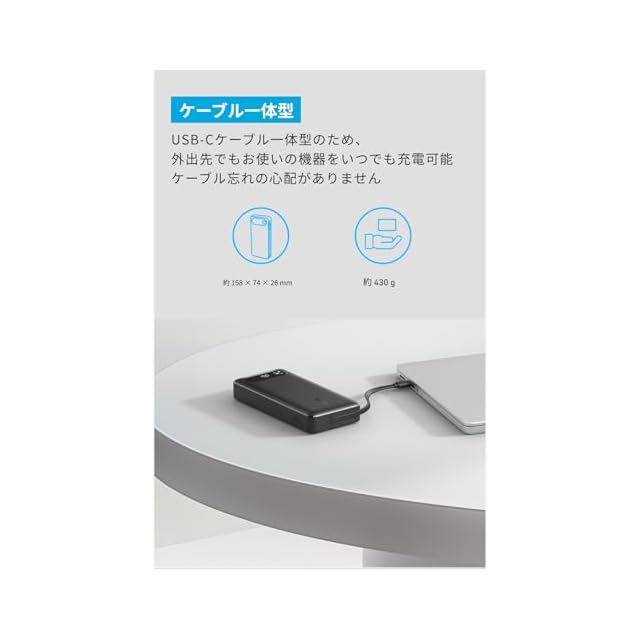 ケーブル一体型で、荷物がスッキリ:USB-Cケーブル一体型のため、外出先でもお使いの機器をいつでも充電可能。ケーブル忘れの心配がありません。