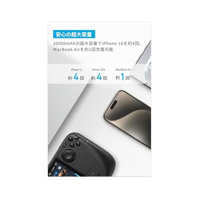 安心の超大容量:20000mAhの超大容量でiPhone 16を約4回、Galaxy S24を3回以上満充電できます。