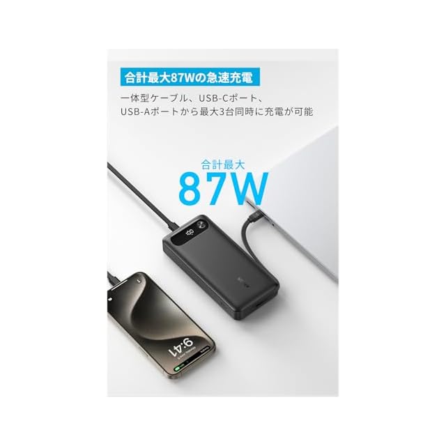 合計最大87Wの急速充電:USB PD対応のUSB-Cポートは最大65Wの高出力に対応し、iPhone 16シリーズやタブレット端末だけでなく、ノートPCにも充電が可能です。