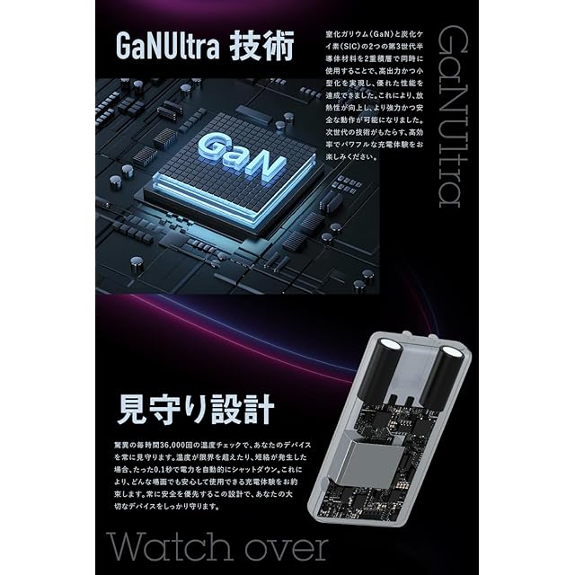 【GaNUltra 技術】 窒化ガリウム(GaN)と炭化ケイ素(SiC)の2つの第3世代半導体材料を2重積層で同時に使用することで、高出力かつ小型化を実現し、優れた性能を達成できました。これにより、放熱性が向上し、より強力かつ安全な動作が可能になりました。次世代の技術がもたらす、高効率でパワフルな充電体験をお楽しみください。
