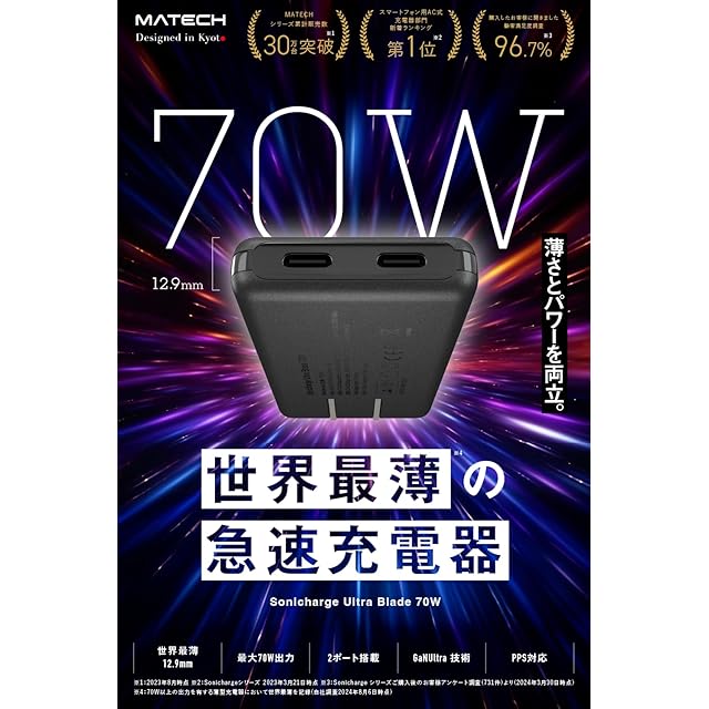 商品名:MATECH 充電器 超薄型 70W 65W対応 Type-C PD【史上最薄12.9mm / GaNUltra搭載/タイプC 急速充電 2ポート / 折りたたみ式プラグ/MacBook・ノートパソコン・iPhoneシリーズ対応】 (70W)