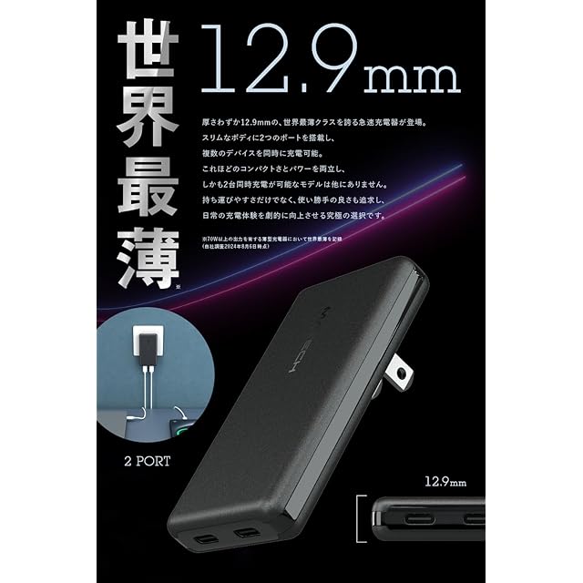 【世界最薄12.9mm】 厚さわずか12.9mmの、世界最薄クラスを誇る急速充電器が登場。スリムなボディに2つのポートを搭載し、複数のデバイスを同時に充電可能。これほどのコンパクトさとパワーを両立し、しかも2台同時充電が可能なモデルは他にありません。持ち運びやすさだけでなく、使い勝手の良さも追求し、日常の充電体験を劇的に向上させる究極の選択です。※70W以上の出力を有する薄型充電器において世界最薄を記録 (自社調査2024年8月6日時点)