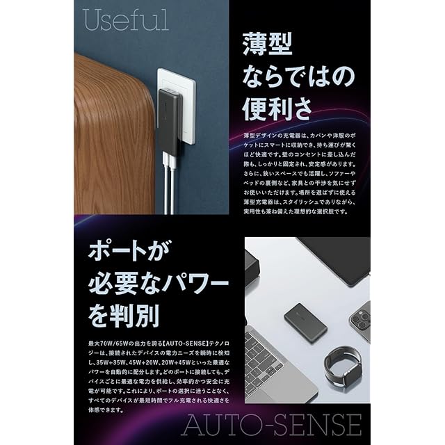 【ポートが必要なパワーを判別】 最大70W/65Wの出力を誇る【AUTO-SENSE】テクノロジーは、接続されたデバイスの電力ニーズを瞬時に検知し、35W+35W、45W+20W、20W+45Wといった最適なパワーを自動的に配分します。どのポートに接続しても、デバイスごとに最適な電力を供給し、効率的かつ安全に充電が可能です。これにより、ポートの選択に迷うことなく、すべてのデバイスが最短時間でフル充電される快適さを体感できます。
