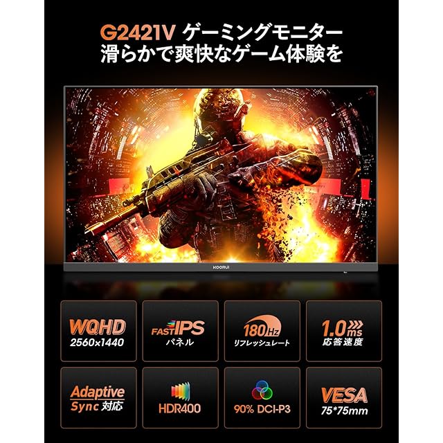 商品名:KOORUI ゲーミングモニター 24インチ WQHD (2560x1440) 180Hz 1ms (GTG) Fast IPSパネル Adaptive Sync対応/DCI-P3 90%/HDR400/ HDMI×2/DP ブルーライト低減 VESAマウント対応 G2421V