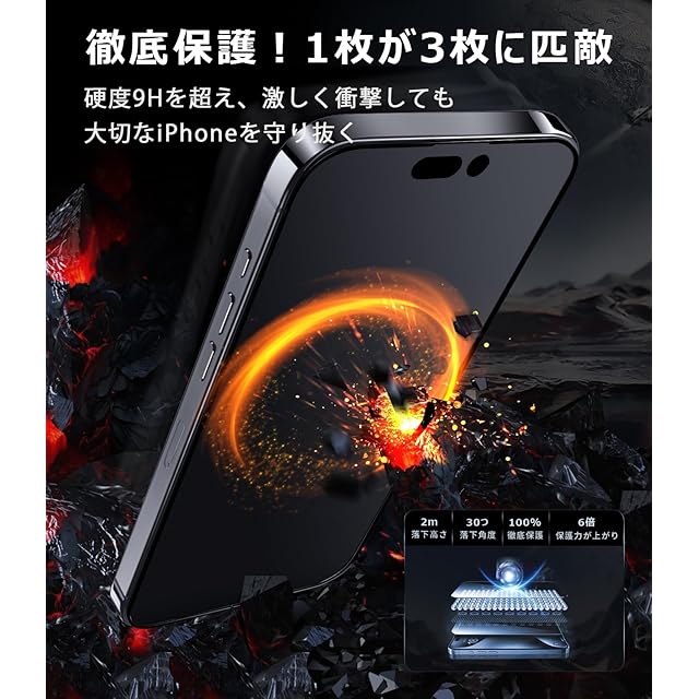 【1枚が3枚に匹敵】iphone16promax用 覗き見防止 ガラスフィルムは、硬度9Hを超える強化ガラスを採用し、破損のリスクを低減し、使用寿命を延ばします。さらに、刃物などの鋭利なものでも使用中に表面を傷つけることなく、外部からの衝撃からスマホを保護します。