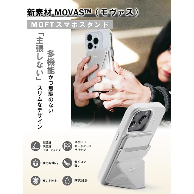 ✨【最新のヴィーガンレザー「MOVAS」採用!洗練されたスリムデザインで高耐久性】 「MOVAS」は、MOFTが誇りを持って開発したヴィーガンレザーで、その特長は一見の価値があります。この素材は驚くほど繊細な手触りを備えながら、同時に高い耐久性を持ち、さらには環境への優しさも追求しています。その結果、この素材を使用したスマホスタンドは、優れた張力と靱性を誇り、ポケットにキーホルダーやカードキーと一緒に収納しても傷がつきにくいのが特長です。洗練されたスリムデザインは、ユーザーに高級感をもたらし、日常のスタイリッシュな使い勝手を追求した結果として、このヴィーガンレザーのスマホスタンドは他と一線を画しています。 【超薄型デザインの便利さを超越!スタイリッシュな展開可能なスマホスタンド】 この製品はスマホスタンドの概念を覆す、超薄型デザインが際立つ一品です。スタンドを畳むことで驚くほどのスリムさを実現し、これにより携帯性が向上。しかしこのスタンドは、単なるスリムさだけではありません。素早く展開してスタンドとして利用することができ、これによってスマホを立てかけたり、動画を見たりする際にも非常に便利です。場所を取らないスマートなデザインは、ユーザーにとって日常生活の中での利便性を最大化します。 【財布いらずの軽快さ!スリムデザインに2枚のカードをスマートに収納】 この製品は財布いらずの新しい生活を提案します。その秘密は、スリムなデザインにありながら、最大2枚のクレジットカードや運転免許証などをスマートに収納できる点です。このスマホスタンドは非常にシンプルでありながら、必要なカードをまとめて持ち歩くことができ、更にはスタンドを展開することで、カードの取り出しも簡単です。外出時の手軽さを求めるユーザーにとって、これはまさに理想的なアクセサリーといえるでしょう。 【MagSafe対応の自在な使い勝手!360度向きを変えるスマホスタンド】 このスマホスタンドは、MagSafe対応機種に対して自在な使い勝手を提供します。マグネット内蔵で、思い通りに向きを切り換えることが可能で、縦置き、横置き、フローティングモードに簡単に切り換えることができます。この自由度の高い機能は、ユーザーが様々なシーンや状況に対応できることを意味し、スマホの使い勝手を飛躍的に向上させます。【ユニークな磁力の進化!MOFT Snapケースと組み合わせて個性を引き立てる】 MOFT Snapケースと組み合わせることで、この製品は一段と進化します。新しい磁石の採用により、スマホにより強力な磁気でしっかり固定できるのが特長です。この強力な磁力を生かし、ユーザーは自分だけのカラーの組み合わせで個性をアピールすることができます。これによって、単なるスマホスタンドではなく、ユーザーのライフスタイルやスタイルを豊かに彩るアクセサリーとなっています。 ✅【対応機種と注意事項】iPhone 15/14/13/12全シリーズに対応できます。または、MagSafe機能があるスマホケースやマグネットリングと併用することで使用可能です。*MOFT Snapケースと併用すれば、磁力がさらにアップ!【安心のアフターサービス】 お客様が商品に関して何かお気づきの点やご不明点がございましたら、どうぞお気軽にご連絡ください。私たちはお客様のご満足を最優先に考え、迅速かつ丁寧に対応させていただきます。注文履歴より弊店までご一報いただければ、専門のアフターサポートが迅速に対応いたします❗ 顧客が何を求めているかを理解し、それを基に確かなサービスを提供することを大前提に、お客様に安心してご利用いただけるよう心がけております。どんな些細なことでも結構ですので、お気軽にお知らせください。お客様のご要望に応じて、より良いご対応ができるよう心待ちにしております。